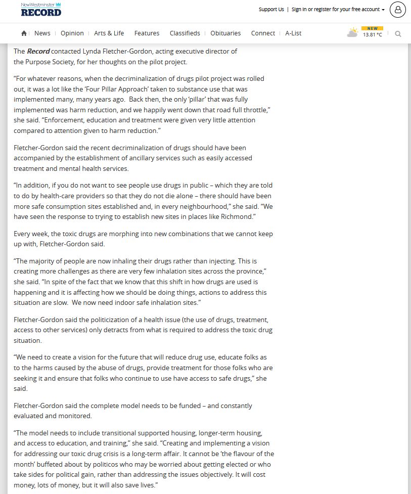 The New Westminster Record contacts our Interim Executive Director, Lynda Fletcher-Gordon about the recent proposed changes to the BC government’s drug decriminalization policy.